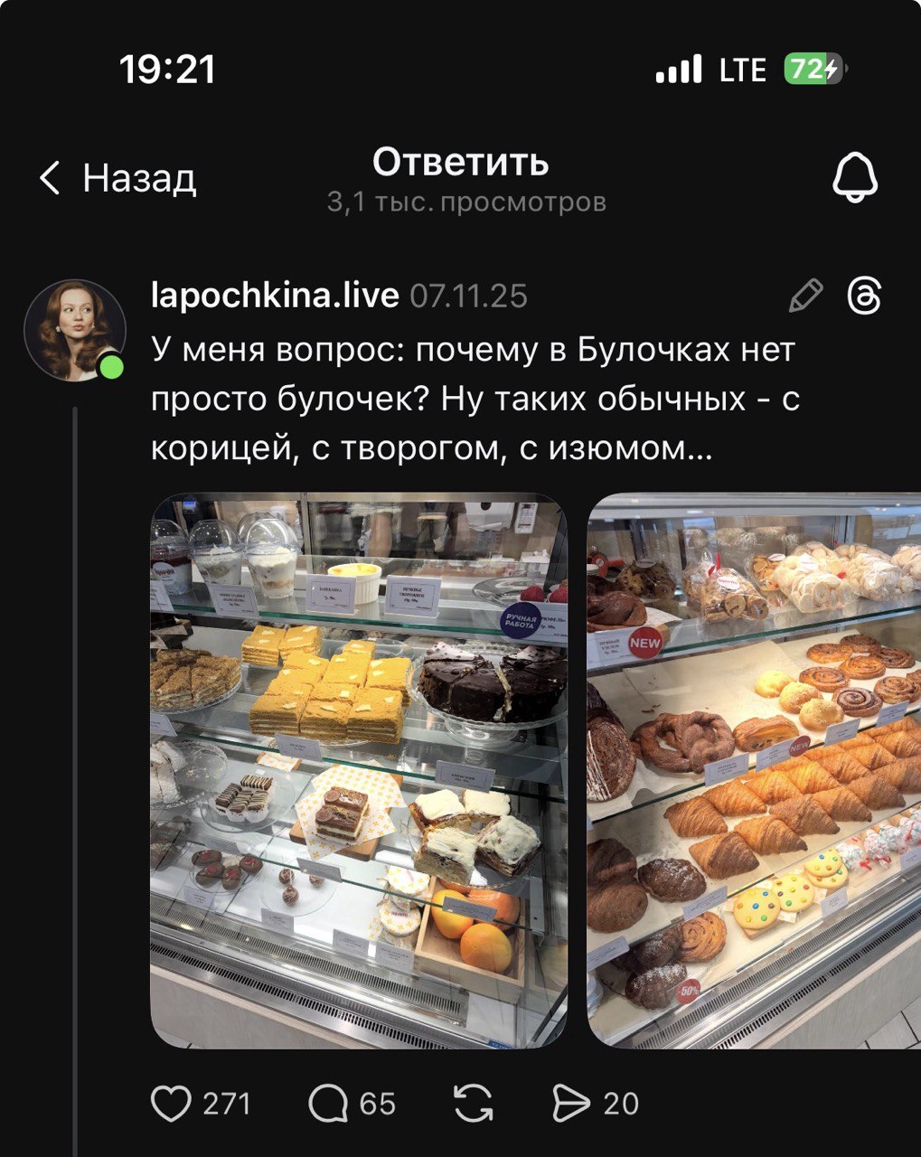 Недавно в соцсети Threads нам попалась публикация девушки по имени Алина. Пост был предельно честным и даже слегка ироничным: она заметила, что в наших “Булочках”… нет обычных булочек. Того самого базового ассортимента, воздушной сдобы, которую можно взять просто так, без повода!